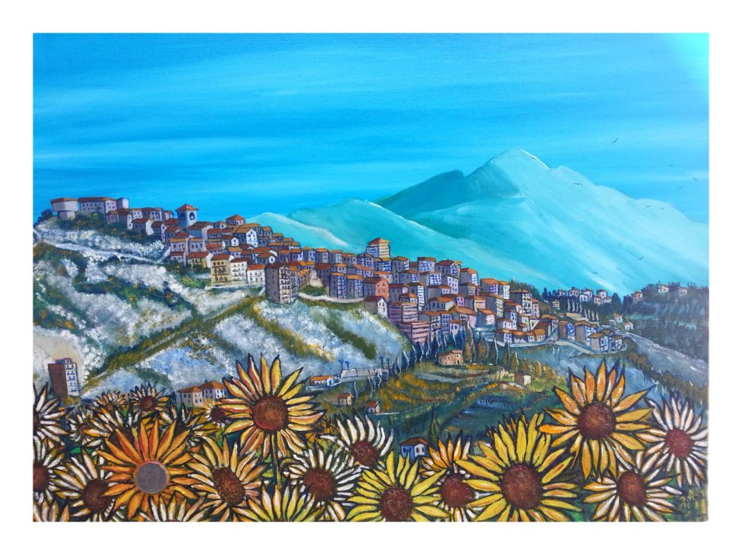 Descrizione: Titolo: Radici di Luce: Memorie di Bellegra Misure: 50x70 cm Tecnica: Olio su Tela Anno: 2005 Descrizione: L'opera rappresenta Bellegra, il paese della mia infanzia, interpretato attraverso la lente della memoria e dell'emozione. In linea con il tema "I Colori della mia Terra", ho voluto catturare l'anima identitaria del luogo: i girasoli in primo piano, dipinti con toni caldi e vibranti, simboleggiano la vitalità dei ricordi che, come radici, mi legano a questa terra. Tra di essi, la presenza della moneta da 100£ custodisce un significato intimo e storico: simboleggia l'emigrazione della mia famiglia verso la città alla ricerca di lavoro, un viaggio di speranza e sacrificio che segna il passaggio tra il passato rurale e il futuro, senza mai spezzare il legame con le origini. Sullo sfondo, il borgo arroccato e le montagne si stagliano in tonalità di azzurro e ciano, evocando la quiete e la "luce che filtra attraverso il tempo", come suggerito dalle finalità del concorso. L'uso del colore non è solo descrittivo ma psicologico: è un dialogo tra la terra (la storia, il vissuto) e la luce (il presente, l'emozione viva).